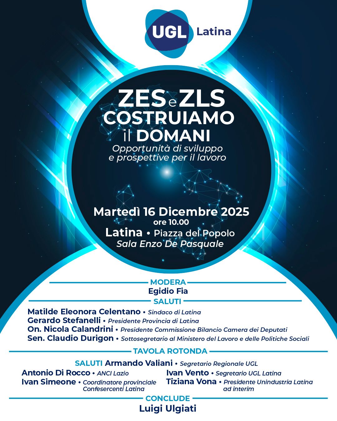 Si intitola “Opportunità di sviluppo e prospettive per il lavoro” l’incontro promosso da UGL Latina, dedicato al ruolo delle Zone Logistiche Speciali (ZLS), delle Zone Economiche Speciali (ZES) e dei consorzi industriali nel rilancio del territorio.