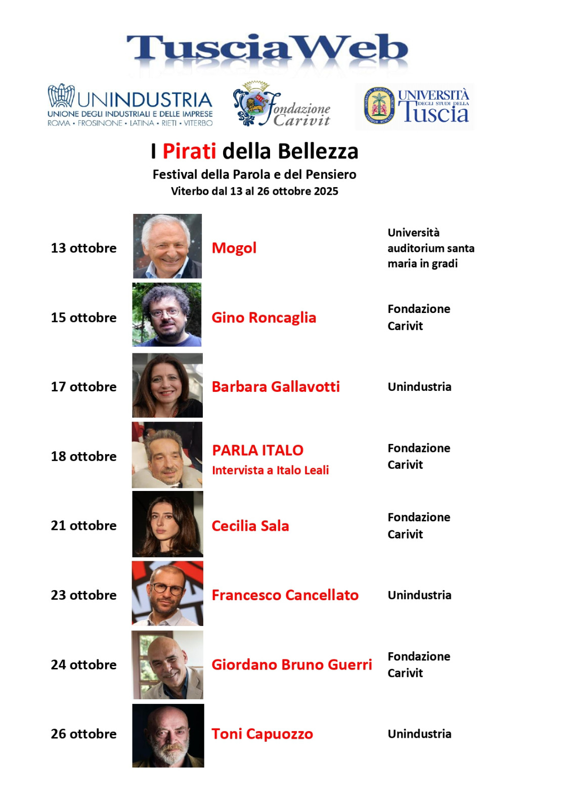 Dal 13 al 26 ottobre 2025 si terrà a Viterbo la manifestazione “I Pirati della bellezza” organizzata dal quotidiano on line Tusciaweb.