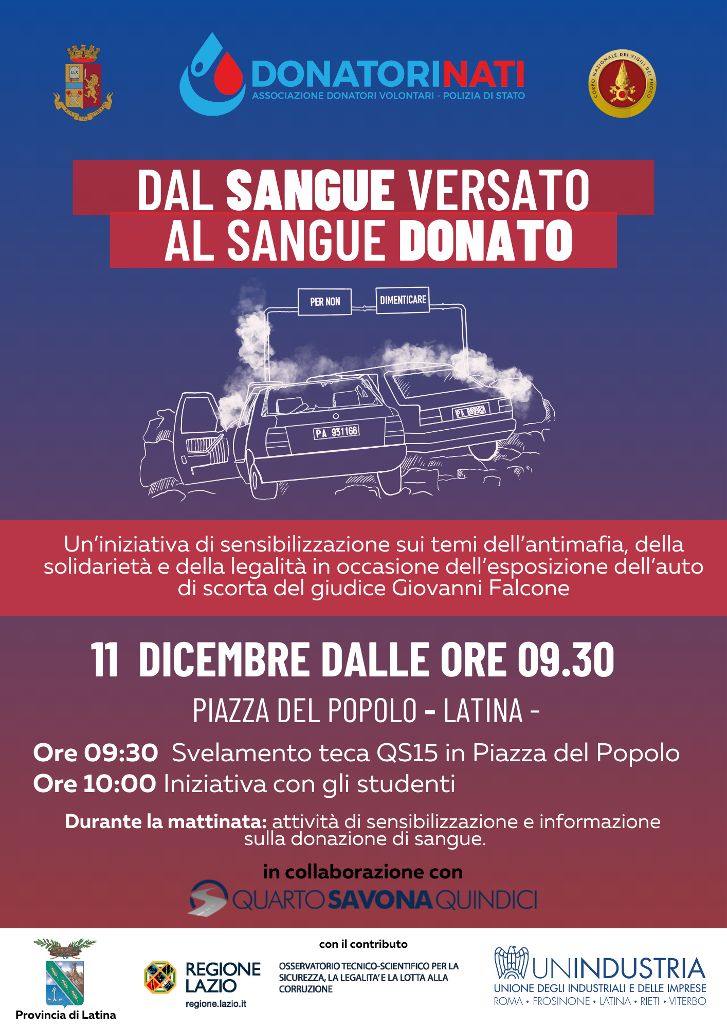 L'iniziativa "Dal sangue versato al sangue donato" rientra nel quadro delle attività dedicate alla diffusione della cultura della legalità, e nasce da una collaborazione tra l'Associazione Donatori Nati della Polizia di Stato, la Questura di Latina e l'Associazione "Quarto Savona 15".