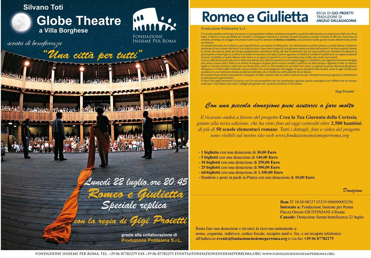 1000 biglietti in due settimane: è la sfida della Fondazione a sostegno del progetto "Crea la Tua Giornata della Cortesia", giunto alla terza edizione, che ha visto fino ad oggi coinvolti oltre 2.500 bambini di più di 50 scuole elementari romane. Il ricavato della replica esclusiva del Romeo e Giulietta di Proietti sarà quindi a favore dell'iniziativa, della quale tutti i dettagli - con foto etc... - sono disponibili a questa pagina sul sito della Fondazione.