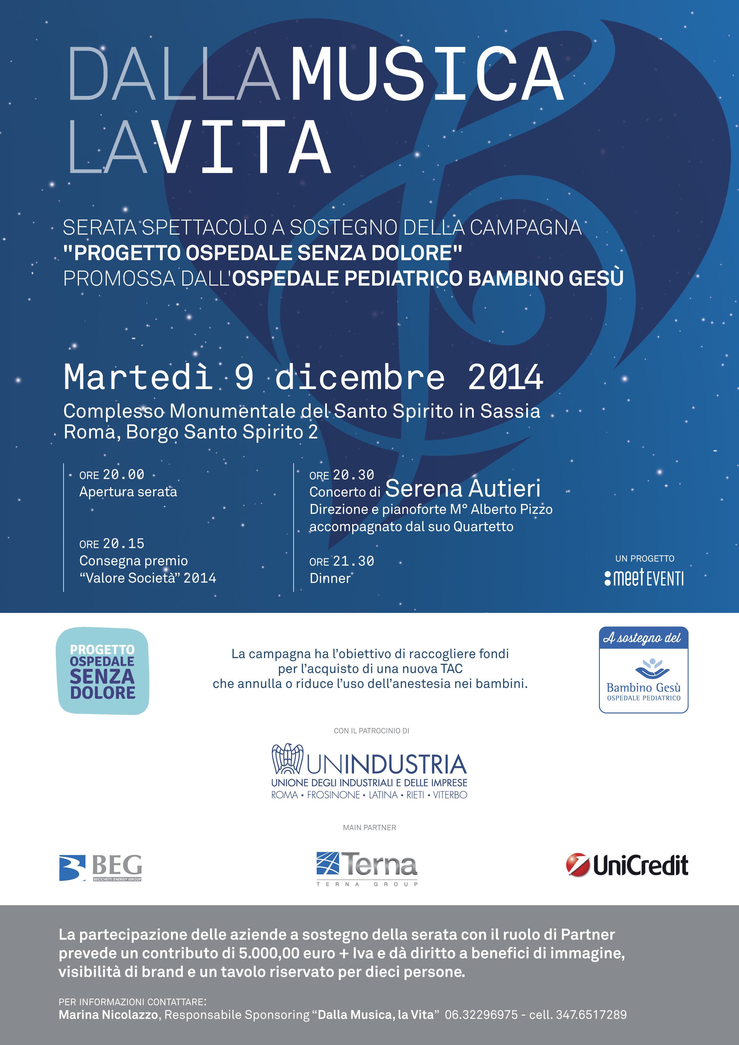 La serata, i cui proventi verranno destinati al “Progetto Ospedale senza dolore”, avrà inizio alle ore 20.00 e si terrà presso il Complesso Monumentale Santo Spirito in Sassia. Sarà articolata in due parti: la prima (ore 20.30) vedrà l’esibizione della cantante Serena Autieri accompagnata dalla sua band nella Sala Baglivi, la seconda parte (ore 21.30) un dinner servito nella Sala Lancisi dello stesso Complesso.