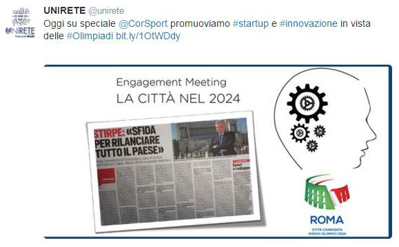 Il presidente del Comitato 2024 Luca di Montezemolo chiama a raccolta domani alle ore 10.30 presso la sala stampa dello Stadio Olimpico, startupper, innovatori, talenti, università e imprese per rileggere insieme, in occasione della candidatura ai Giochi olimpici, le necessità, anche sociali, di una Capitale che arranca verso il futuro; per calibrare al meglio la nuova quotidianità tenendo conto dell’evoluzione delle tecnologie e dell’innovazione; per rendere infine più accessibile, più accogliente, digitalizzata e più vivibile la città.