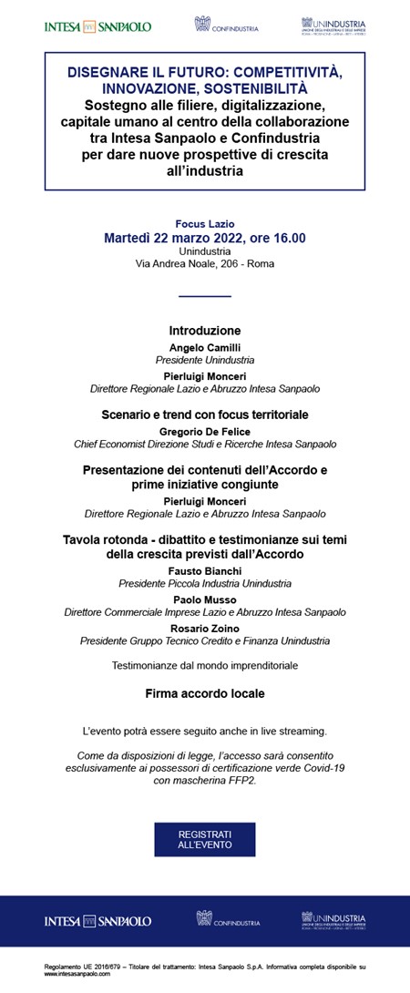 Il prossimo 22 marzo alle ore 16.00 Unindustria e Intesa Sanpaolo presentano il nuovo accordo, siglato lo scorso 18 ottobre a livello nazionale da Confindustria, che rinnova la collaborazione avviata nel 2009. Tra gli assi individuati nell'Accordo saranno approfonditi i temi della sostenibilità e del riequilibrio finanziario.
