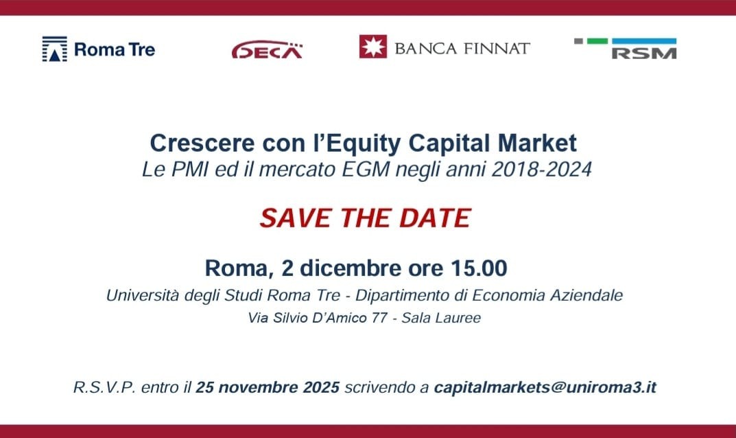L'incontro 'Crescere con l'Equity Capital Marketing' si svolgerà il 2 dicembre p.v. alle ore 15.00 presso il Dipartimento di Economia Aziendale dell'Università degli Studi Roma in via Silvio D'Amico, 77 (Sala Lauree).