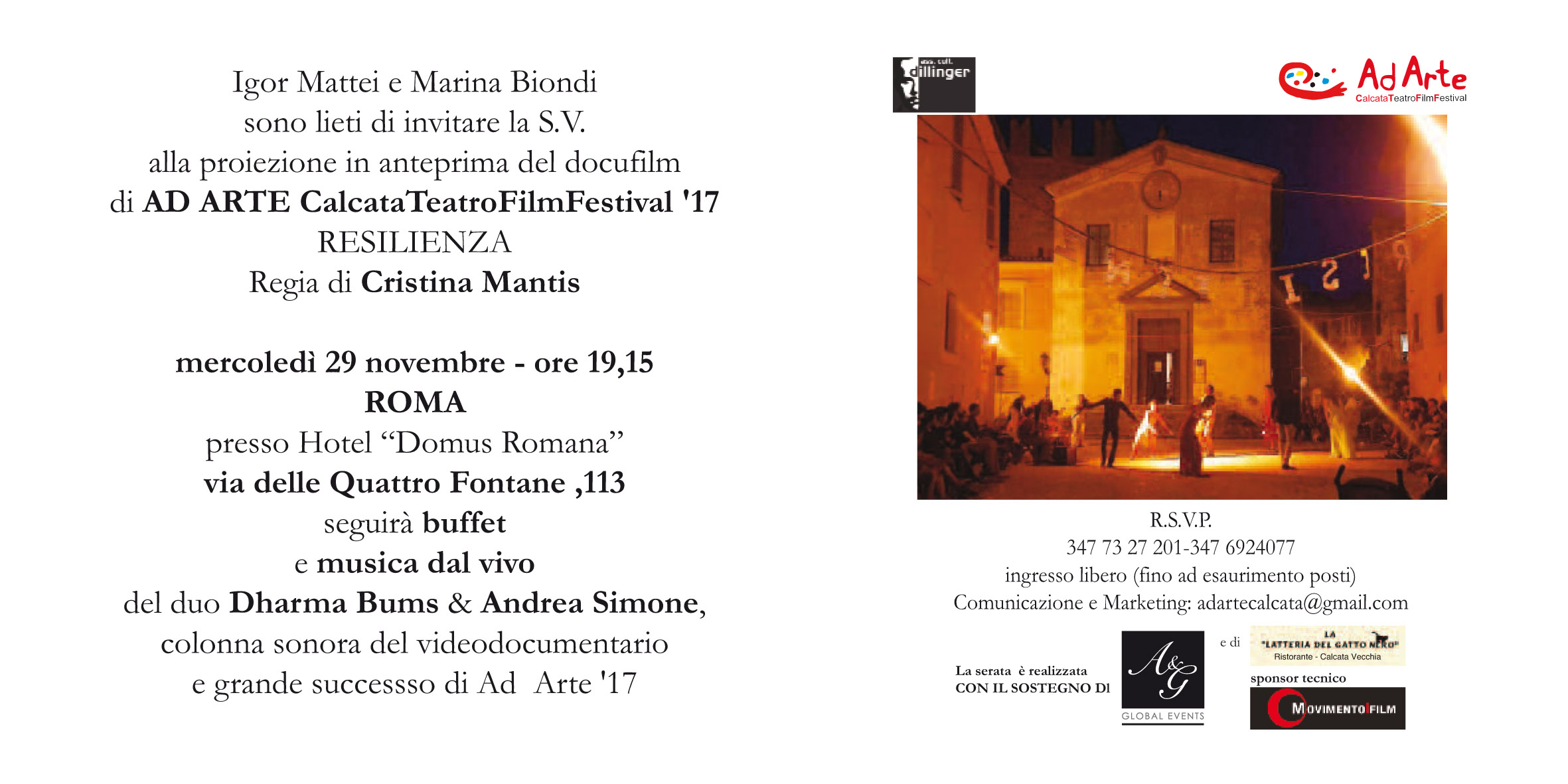 Siamo lieti di segnalare l'appuntamento con l'anteprima romana del Docufilm di "AD ARTE Calcata Teatro Film Festival 2017- Resilienza" (Dir. Art. Igor Mattei e Marina Biondi, Regia di Cristina Mantis) del prossimo mercoledì 29 Novembre alle ore 19.15 a Roma, che si terrà presso l'Hotel "Domus Romana" in via delle Quattro Fontane 113.