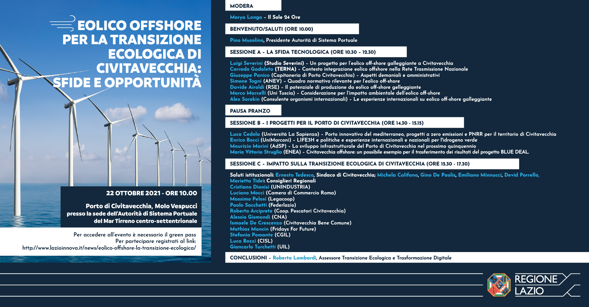L'Assessorato alla Transizione Ecologica e Trasformazione Digitale della Regione Lazio e Lazio Innova, hanno organizzato un evento di approfondimento e riflessione sull'eolico offshore e le energie rinnovabili, che si svolgerà venerdì 22 ottobre, dalle ore 10 alle 18, presso il Porto di Civitavecchia (Molo Vespucci snc – sede dell’Autorità di Sistema Portuale del Mar Tirreno centro-settentrionale).