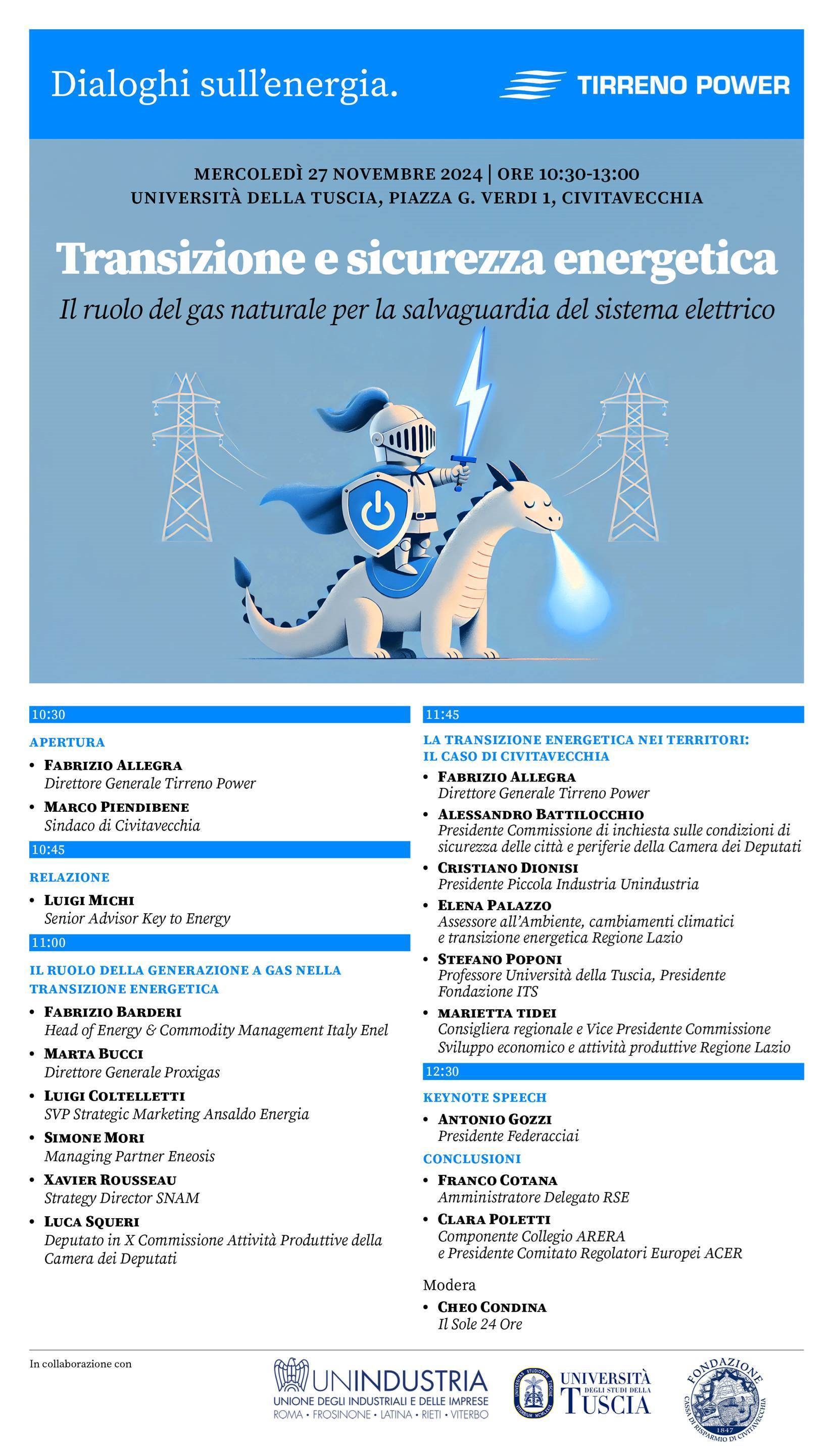 Tirreno Power, con la collaborazione di Unindustria Civitavecchia, l'Università degli Studi della Tuscia e la Fondazione Cariciv, organizza il Convegno “Transizione e sicurezza energetica: il ruolo del gas naturale per la salvaguardia del sistema elettrico”.