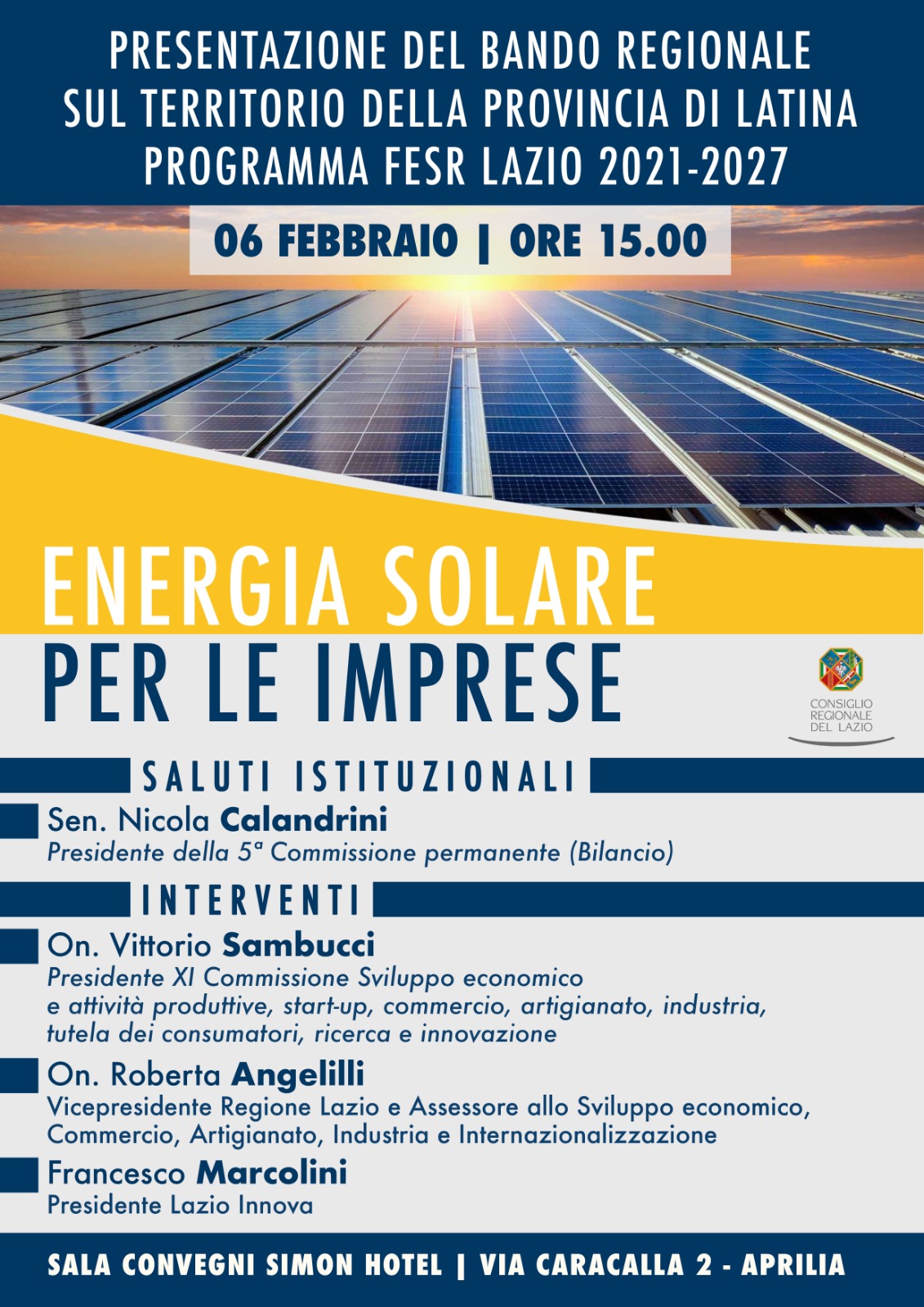 Il prossimo venerdì 6 febbraio alle ore 15:00, presso la Sala Convegni del Simon Hotel di Aprilia - Via Caracalla, 04011 - Aprilia LT) si terrà la presentazione del Bando della Regione Lazio: “Energia Solare per le Imprese”.