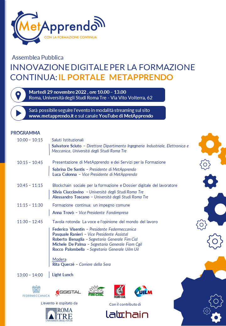 L’evento “INNOVAZIONE DIGITALE PER LA FORMAZIONE CONTINUA: IL PORTALE METAPPRENDO” sarà dedicato alla presentazione del portale e degli appositi Servizi per la Formazione predisposti. In allegato il programma.