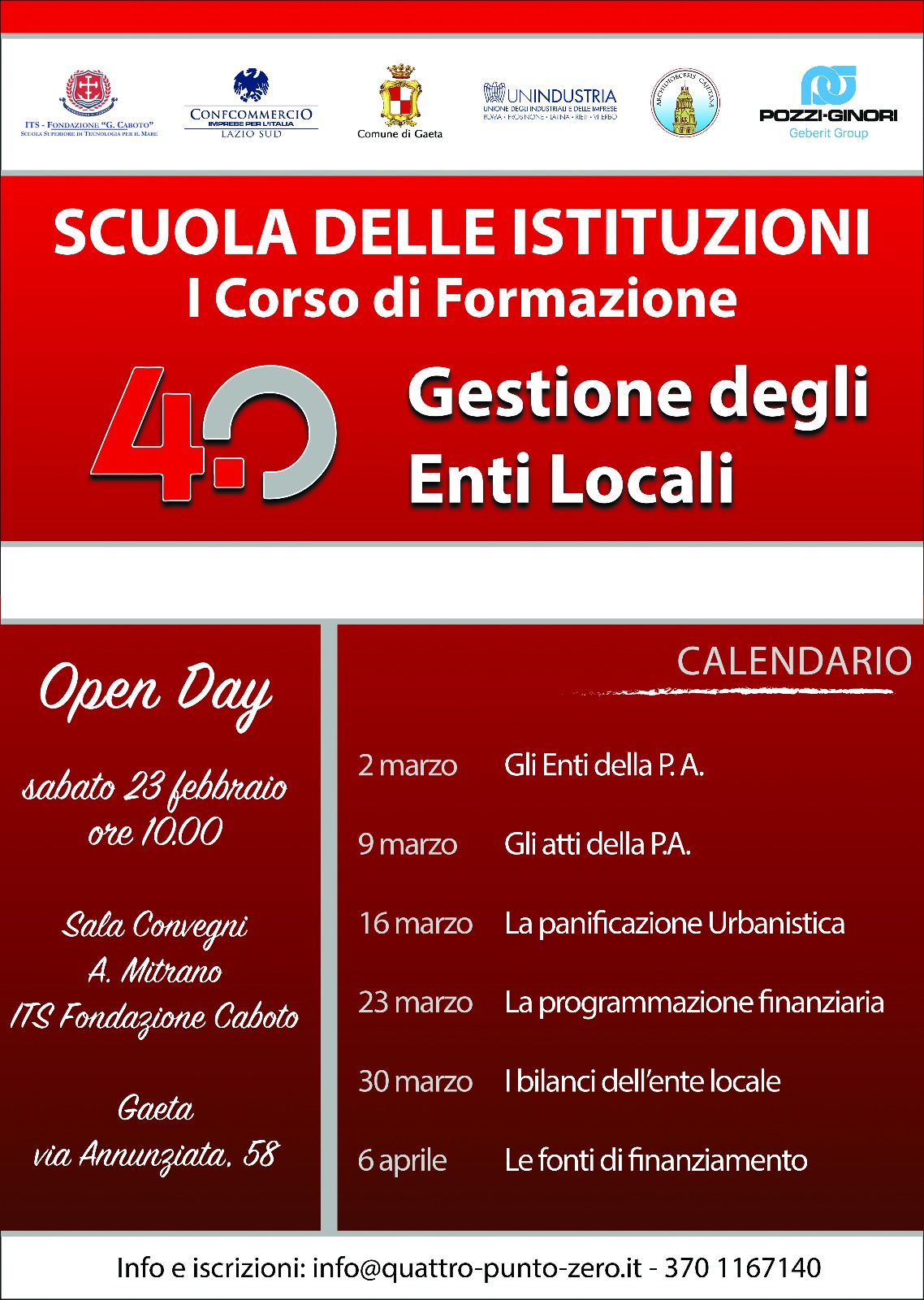 Il prossimo 23 febbraio presso la sala convegni "A. Mitrano" – ITS Fondazione "Caboto", Palazzo della Cultura di Gaeta, si inaugura il corso gratuito promosso dall’Associazione 4.0, presieduta da Giuseppe Rinaldi, con il Patrocinio del Comune di Gaeta, Unindustria Cassino, Confcommercio Lazio-Sud, ITS Fondazione “G.Caboto” Scuola superiore di tecnologia per il mare, Arcidiocesi di Gaeta, Pozzi Ginori Geberit Group.