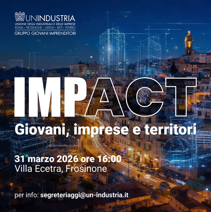 Il prossimo martedì 31 marzo 2026 alle ore 16:00 nella splendida cornice di Villa Ecetra a Frosinone, arriva il primo il primo appuntamento di "IMPACT - Giovani, Imprese e Territori", l'evento del Gruppo Giovani Imprenditori di Unindustria che visiterà tutte le province del Lazio.