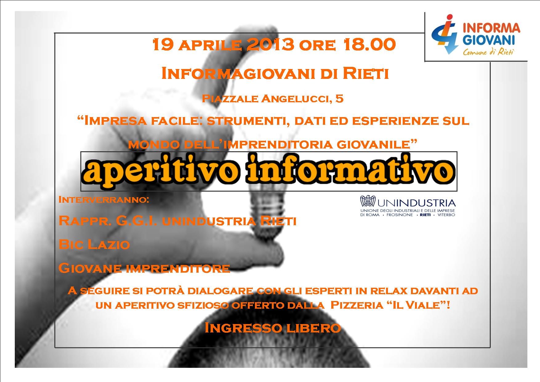 L’ Informagiovani del Comune di Rieti inaugura un nuovo ciclo di aperitivi informativi; incontri informali per informare e saperne di più su argomenti di interesse pubblico, invitando i giovani a partecipare al primo appuntamento che si terrà il giorno venerdì 19 Aprile alle ore 18:00 dal titolo “Impresa facile: strumenti, dati ed esperienze sul mondo dell’imprenditoria giovanile”.