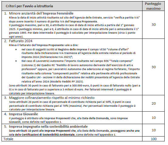 L’avvio ad istruttoria dei progetti segue l’ordine decrescente dei punteggi, calcolato dalle PMI femminili partecipanti sulla base dei seguenti criteri oggettivi: