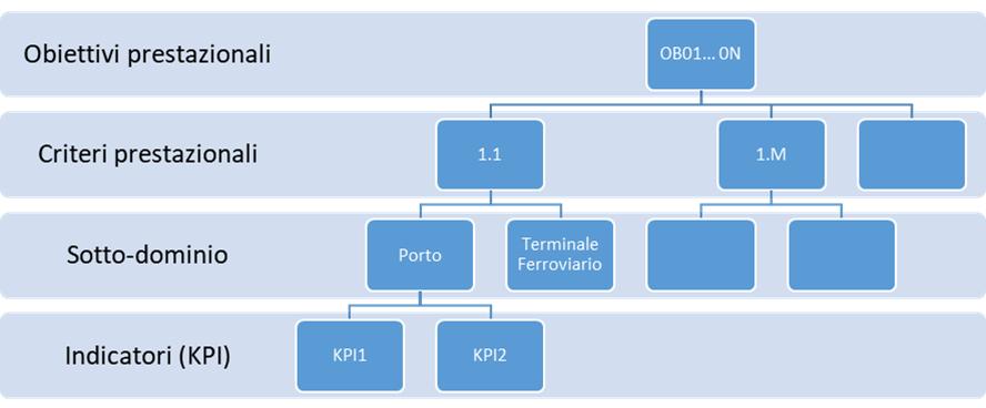 La scelta del sistema di indicatori terrà conto di tali aspetti nel dominio d’interesse. PQuadro LOG ha scelto una struttura a livelli come illustrato in Figura 3. Si deve partire dallo stabilire degli obiettivi prestazionali da indirizzare, seguiti da criteri, da incrociare quindi con il sotto-dominio di applicazione. Gli indicatori saranno quindi specifici per il sotto-dominio, relativi a specifici criteri prestazionali e inquadrati in uno specifico obiettivo.