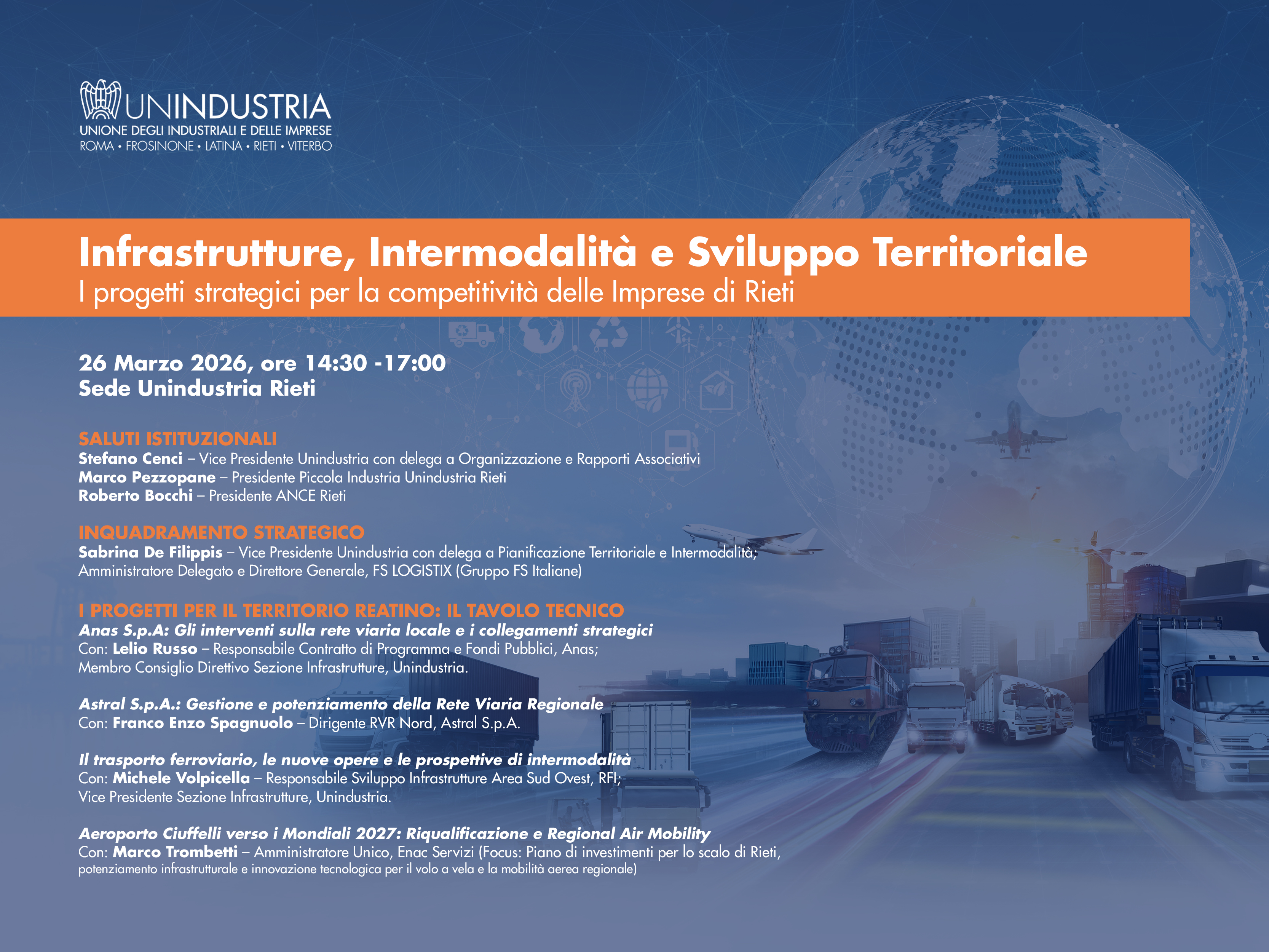 Lo sviluppo economico del territorio reatino è strettamente legato alla sua capacità di connettersi in modo efficiente con i mercati e le grandi direttrici nazionali, per Unindustria questa è una tematica centrale. A tal proposito, per superare la distanza tra la pianificazione sulla carta e le necessità operative, abbiamo organizzato un momento di confronto diretto con i principali player nazionali della mobilità e con le istituzioni regionali, per giovedì 26 marzo alle ore 14:30 a Rieti.