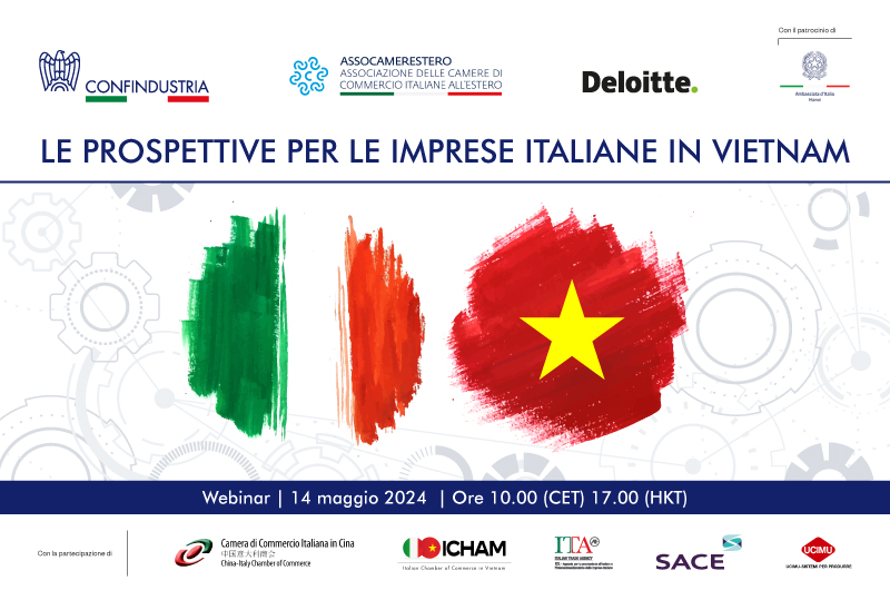 Confindustria, Assocamerestero e Deloitte, con il patrocinio dell’Ambasciata d’Italia ad Hanoi, in collaborazione con Camera di Commercio Italiana in Vietnam, Camera di Commercio Italiana in Cina, ICE Agenzia, SACE e UCIMU-Sistemi per Produrre, sono liete di invitarvi al seminario online “Le prospettive per le imprese Italiane in Vietnam”.