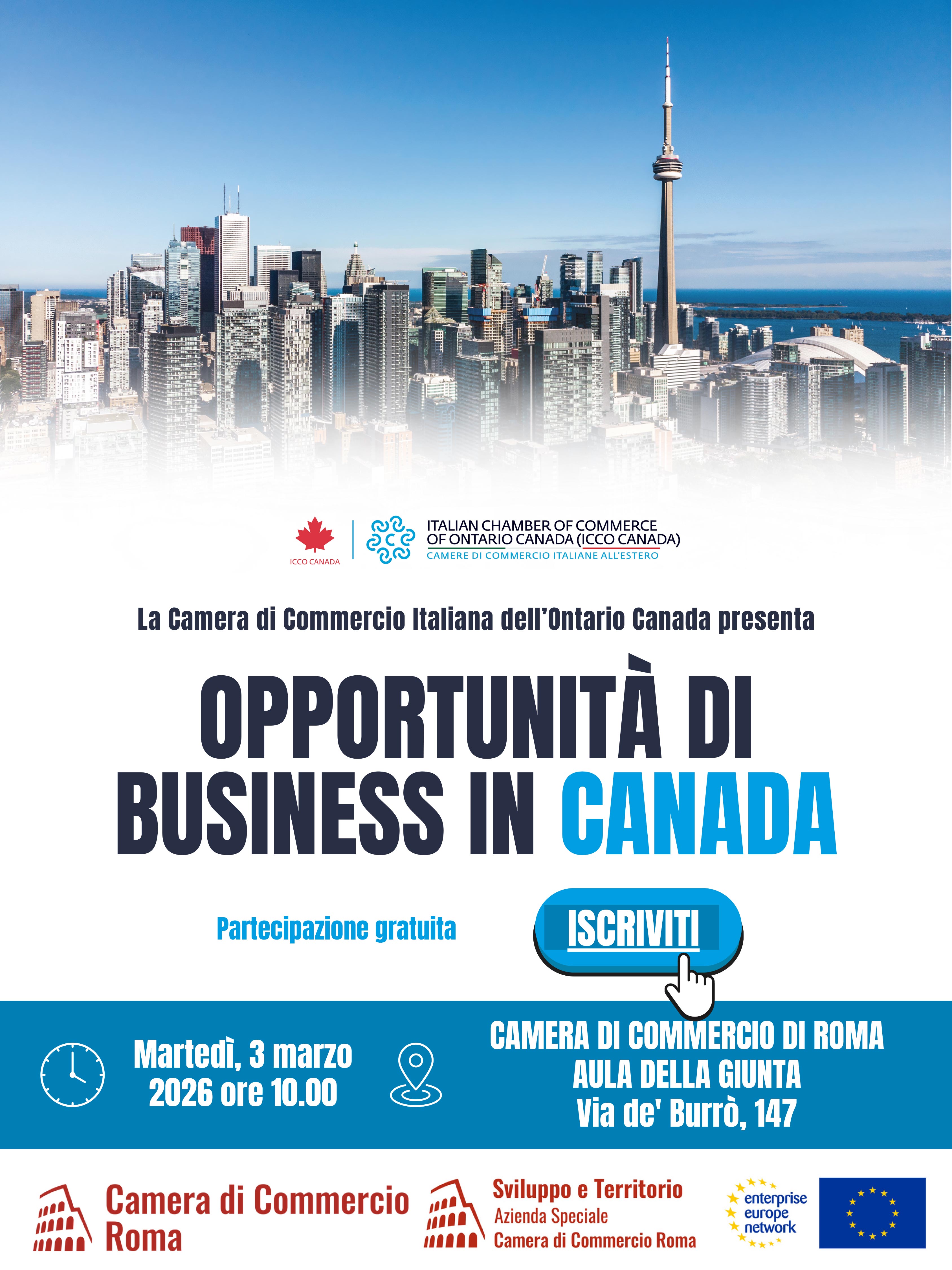 Sviluppo e Territorio, Azienda Speciale della Camera di Commercio di Roma, organizza un incontro dedicato alla presentazione delle opportunità di business in Canada rivolto alle imprese di Roma e provincia. L’appuntamento rientra nelle attività dello Sportello per l’Internazionalizzazione ed è realizzato in collaborazione con la Camera di Commercio Italiana dell’Ontario, con l’obiettivo di illustrare scenari attuali e prospettive future per le aziende interessate a espandersi sul mercato canadese.