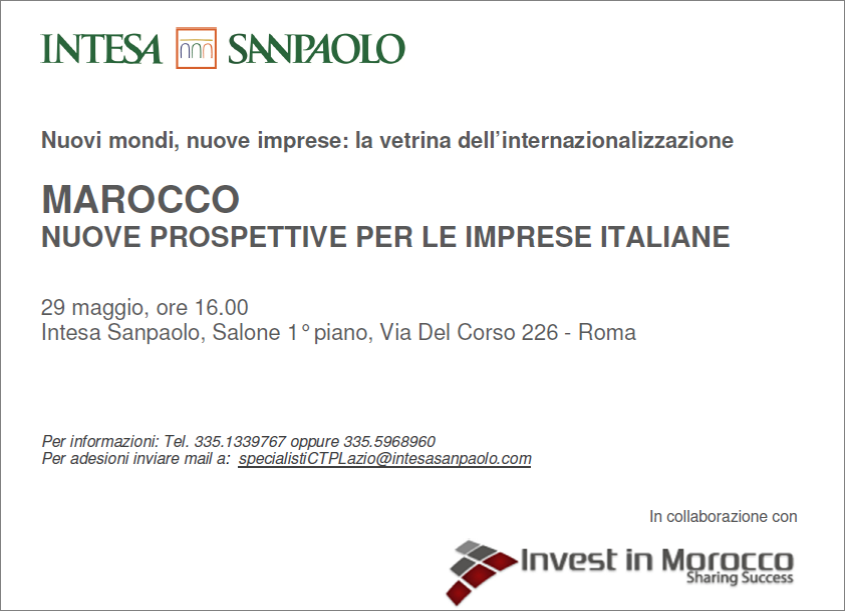 Si informano le Aziende che AMDI - Agenzia Marocchina per lo Sviluppo degli Investimenti, organizza un seminario sulle prospettive per le imprese italiane in Marocco per il giorno 29 maggio con inizio alle ore 16.00.