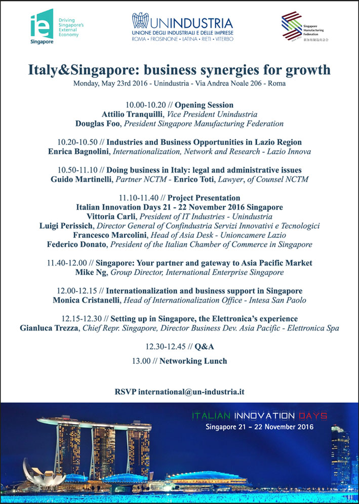 L’incontro si terrà Lunedì 23 Maggio alle ore 10,00 in Unindustria (Via Andrea Noale 206), ed ha l’obiettivo di presentare il quadro dello sviluppo economico e del business in Italia e a Singapore, per identificare potenziali opportunità di investimento, ricerca di partnership o joint-venture con imprese italiane che hanno interessi nel Sud est asiatico.