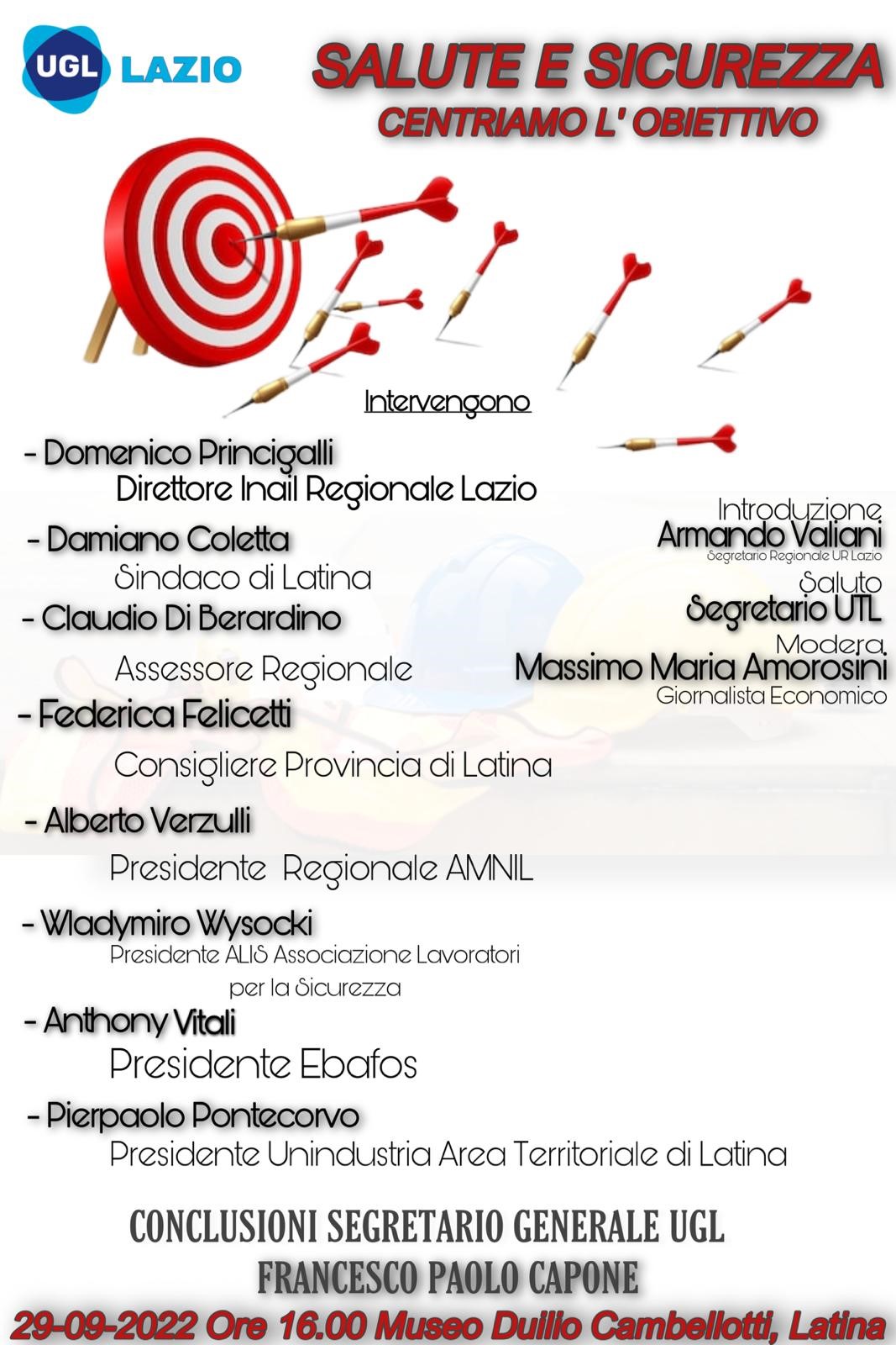 UGL Lazio terrà giovedì 29 Settembre nella splendida cornice del Museo Duilio Cambellotti di Latina, il convegno "Salute e sicurezza, centriamo l'obiettivo" dedicato alla sicurezza sul lavoro.