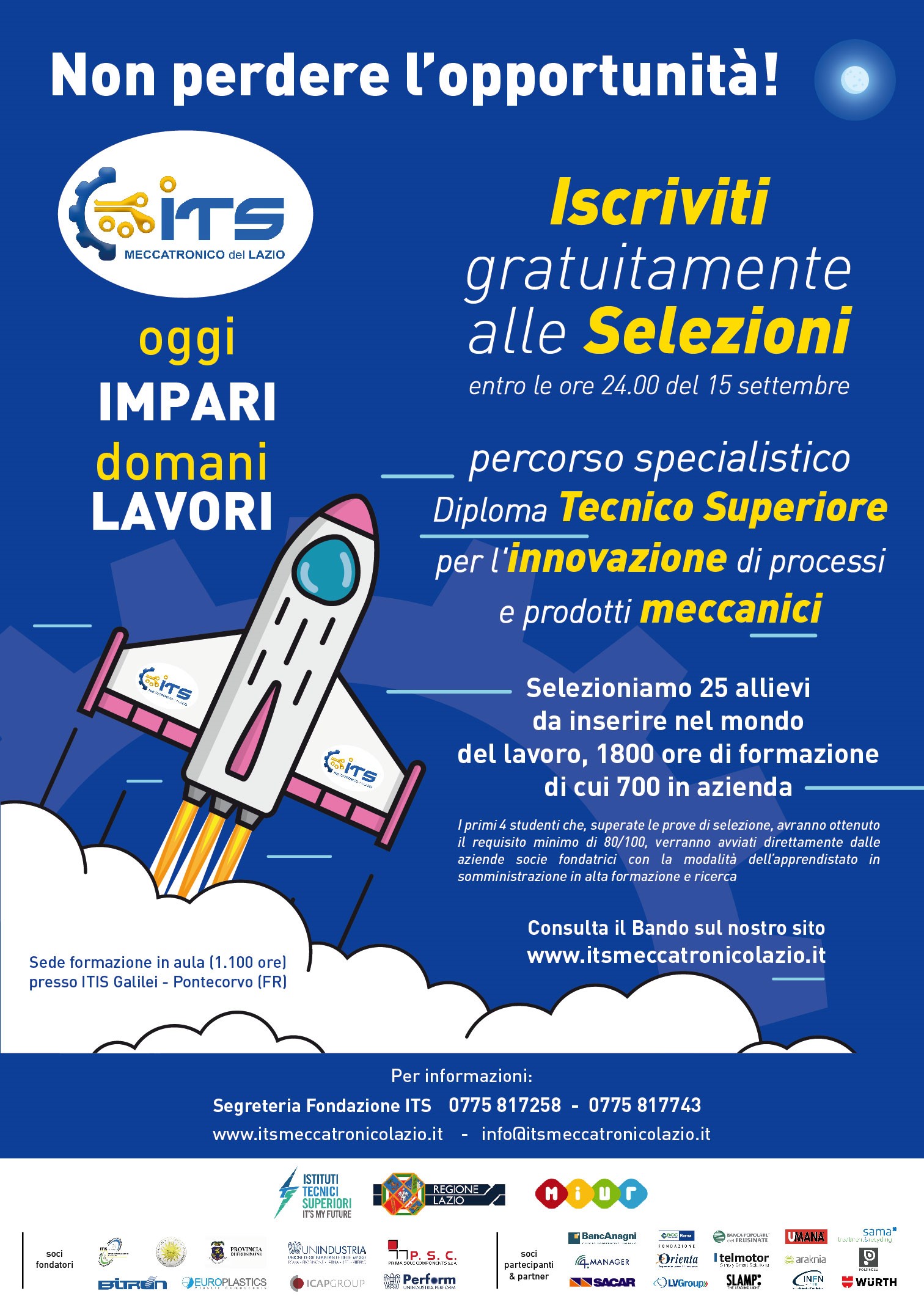 La Fondazione ITS Meccatronico del Lazio apre il Bando per la selezione di 25 studenti al corso ITS biennale per il conseguimento del Diploma di Tecnico Superiore per l’innovazione di processi e prodotti meccanici per il periodo formativo 2021-2023. Al termine del percorso formativo, i Diplomati che avranno sostenuto con pieno profitto il percorso curriculare ed il tirocinio svolto in azienda, saranno inseriti nelle realtà produttive del territorio.