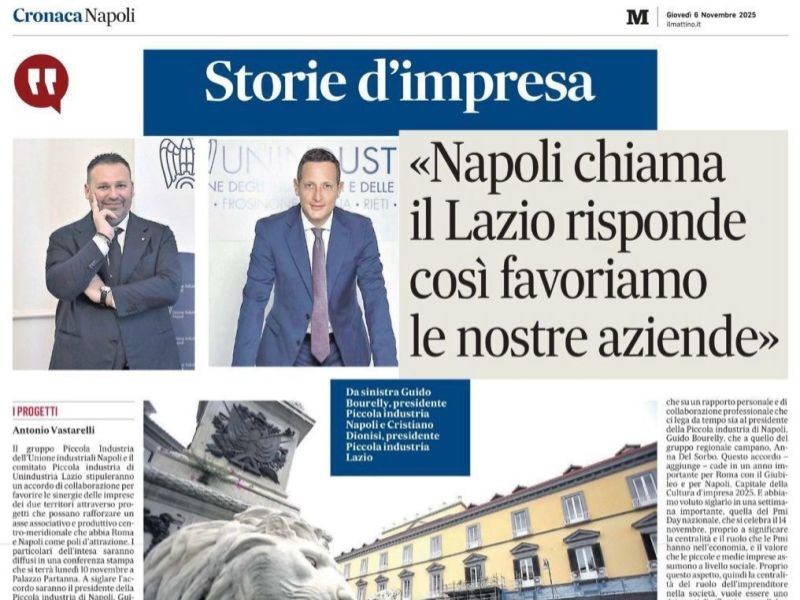 Realizzazione di un network tra le Pmi che realizzi ecosistemi di imprese e processi di integrazione di business su scala interregionale. È questa la finalità prioritaria della storica intesa firmata oggi a Palazzo Partanna dal Presidente del Gruppo Piccola Industria di Unione Industriali Napoli, Guido Bourelly, dal Presidente del Comitato Piccola Industria dell’Unione degli Industriali e delle imprese di Roma, Frosinone, Latina, Rieti, Viterbo, Cristiano Dionisi, e dal Presidente del Comitato Piccola Industria dell’Area Roma Unindustria, Oscar Ricci.