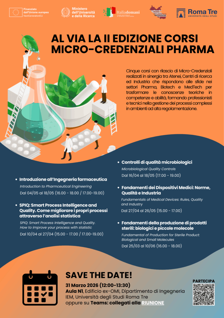 Si svolgerà martedì 31 marzo 2026 dalle ore 12.00 alle ore 13.30, presso l’Università degli Studi Roma Tre, Dipartimento di Ingegneria - Aula N1 (edificio ex-OMI), il secondo appuntamento per illustrare i corsi Micro-Credenziali Pharma.