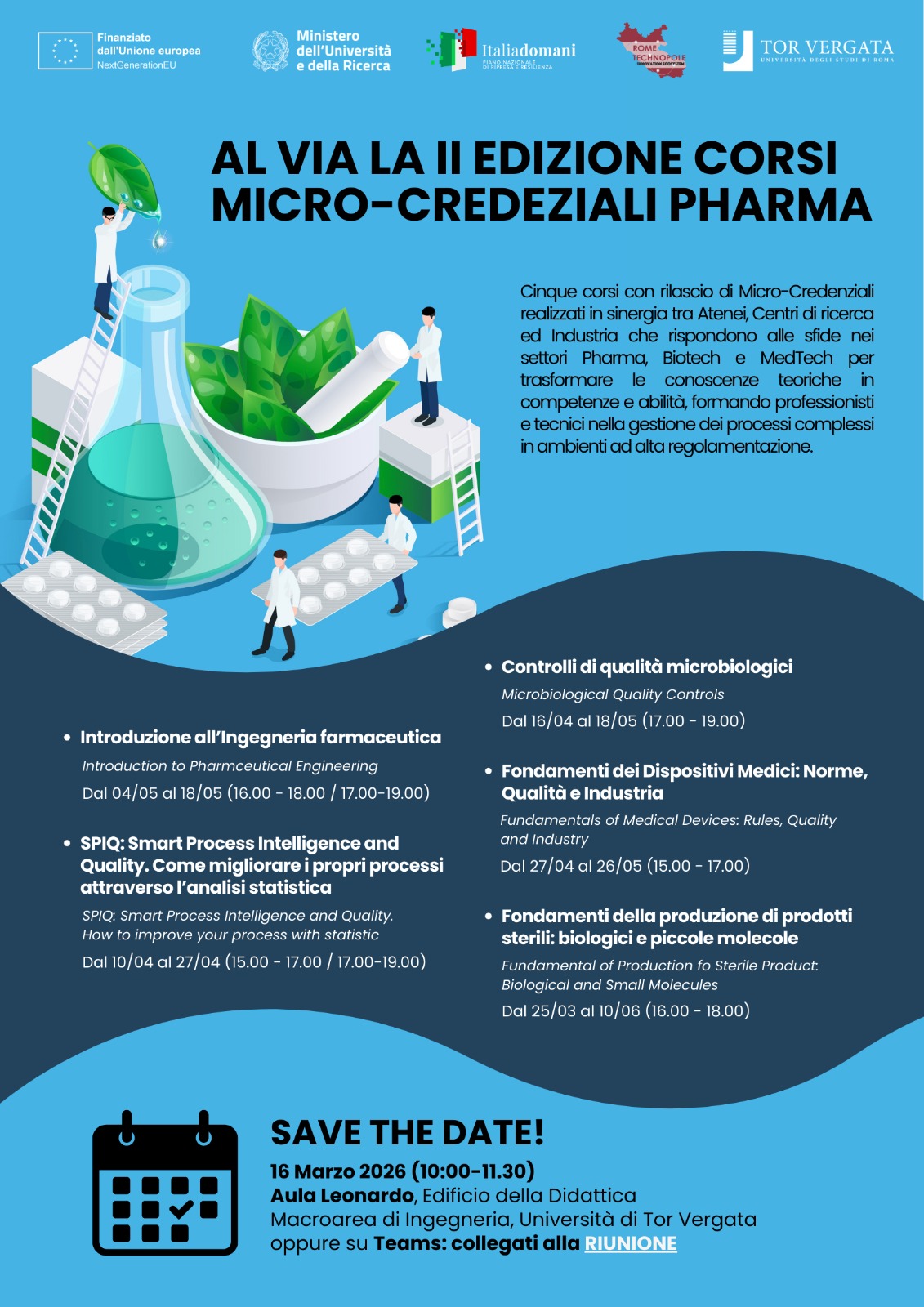 A seguito del grande successo di partecipazione ai corsi Micro-Credenziali Pharma, è in partenza il secondo ciclo dell’offerta formativa gratuita rivolta al personale dell’industria, a studenti, ai dottorandi, assegnisti di ricerca, borsisti di ricerca delle Università del Lazio e a studenti ITS, con la finalità di valorizzare competenze richieste in ambito accademico e nel mercato del lavoro nell’area di competenza Salute e Biopharma.