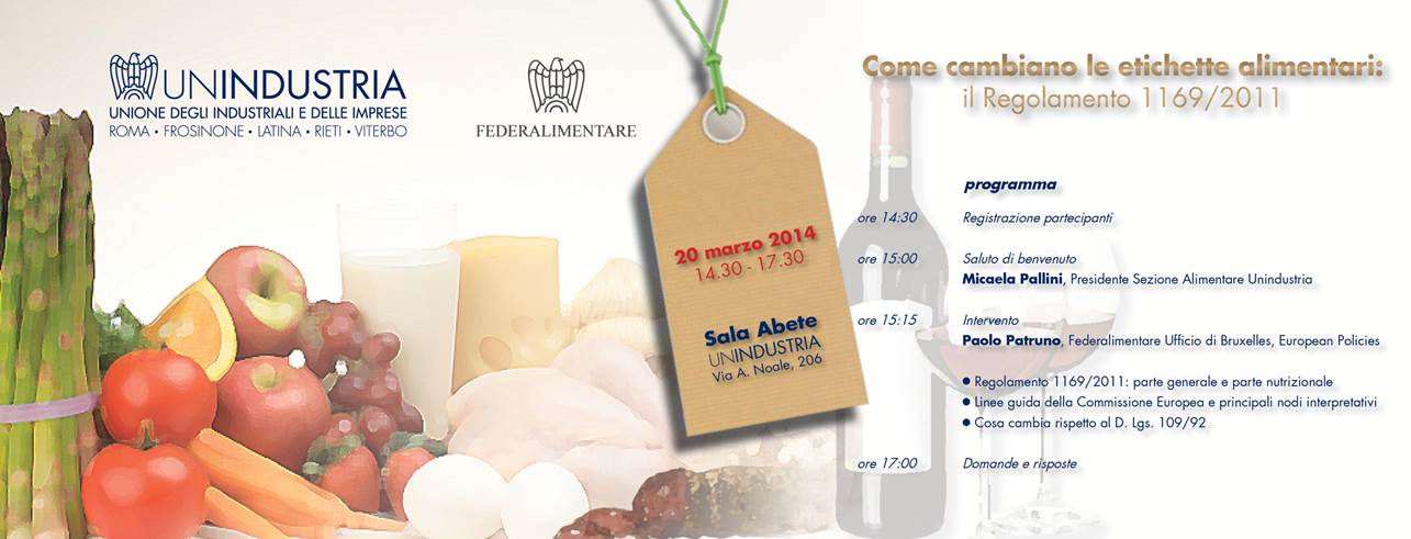 Il prossimo 20 marzo 2014, dalle ore 14.30 alle 17.30, la Sezione Alimentare di Unindustria organizza un seminario avente ad oggetto Il Regolamento Ue 1169/2011 relativo alla etichettatura dei prodotti alimentari che introduce modifiche in materia di etichettatura nutrizionale e abroga alcune precedenti direttive concernenti l’etichettatura e la presentazione dei prodotti alimentari.