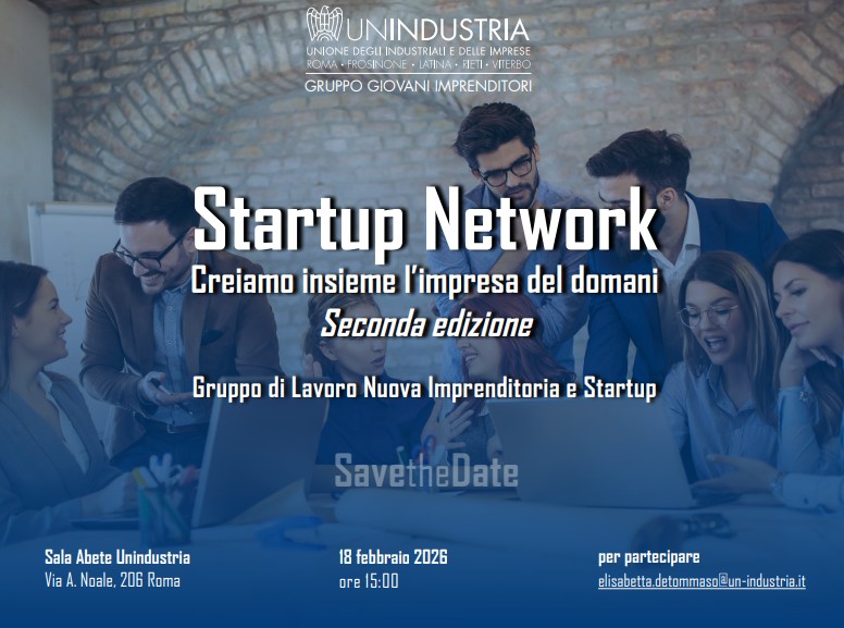 Si terrà il prossimo mercoledì 18 febbraio 2026 alle ore 15.00 presso la sede di Unindustria a Roma la Seconda edizione di “Startup Network. Creiamo insieme l’impresa del domani” organizzato dal Gdl Nuova Imprenditoria e Startup.