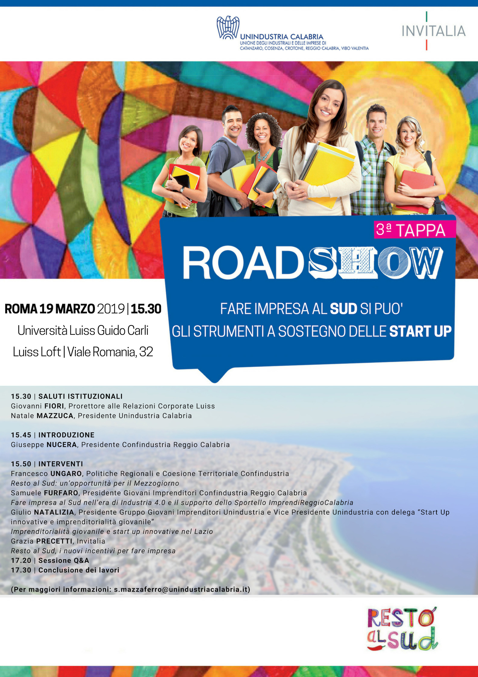 Il prossimo martedì 19 marzo a Roma si terrà la terza tappa del roadshow "Fare impresa al Sud si può, gli strumenti a sostegno delle start up", promosso da Unindustria Calabria e Confindustria Reggio Calabria in collaborazione con Invitalia. L'evento, che sarà ospitato dalla Luiss Guido Carli (Viale Romania, 32 – Luiss LOFT, inizio ore 15.30), vuole informare gli studenti - in particolare quelli del Sud - sugli importanti strumenti a sostegno dell'imprenditoria giovanile nel Mezzogiorno: un focus specifico riguarderà infatti la misura "Resto al Sud", l’incentivo che sostiene la nascita di nuove attività imprenditoriali avviate da giovani tra i 18 ed i 35 anni residenti in una delle seguenti regioni: Abruzzo, Basilicata, Calabria, Campania, Molise, Puglia, Sardegna e Sicilia. Tra i relatori dell'incontro anche Giulio Natalizia, Presidente del Gruppo Giovani Imprenditori Unindustria e Vice Presidente Unindustria con delega “Start Up innovative e imprenditorialità giovanile”.