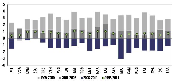 Tra il 2007 e il 2011, a causa degli effetti della crisi economica, il Pil in volume è diminuito in tutte le aree del Paese. Per il Centro-Nord, la riduzione media annua è stata di circa l’1%, mentre più marcata appare la contrazione nel Mezzogiorno (-1,7%), dove i risultati peggiori riguardano Molise (-3,0%) e Campania (-2,2%). Nel Nord è il Piemonte ad avere la performance più negativa (-1,5%). Nel Lazio il Pil è calato dell’1,2% nel periodo considerato.