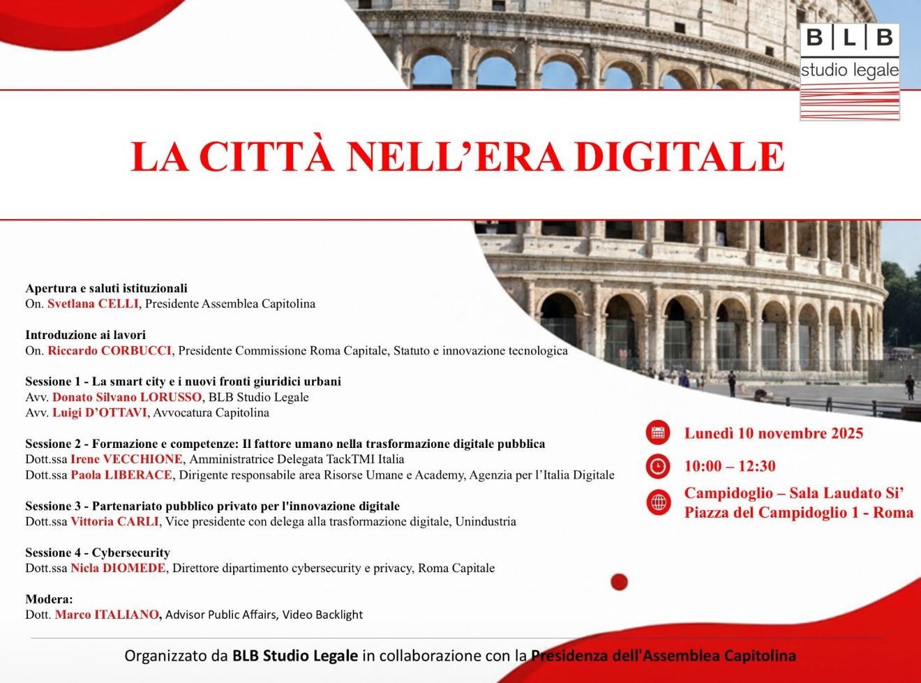 All'appuntamento dal titolo "La città nell'era digitale" in programma il 10 novembre 2025 ore 10.00 in Campidoglio interverrà la Vice Presidente Unindustria con delega Transizione digitale Vittoria Carli.