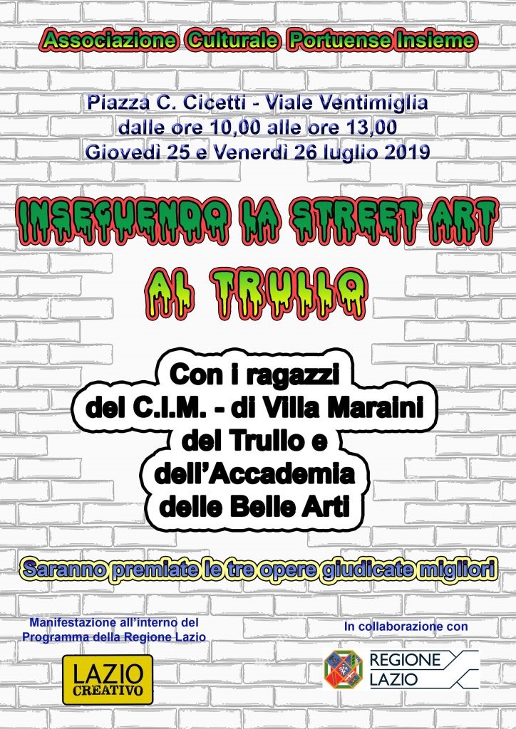 Il prossimo 25 e il 26 luglio 2019, dalle ore 10 alle ore 13, si terrà nel Mercato Rionale Coperto del Trullo,a Roma, l'evento 'Inseguendo la Street Art al Trullo', che coinvolge giovani creativi under 35 del territorio laziale in una competizione artistica che prende vita negli spazi pubblici.